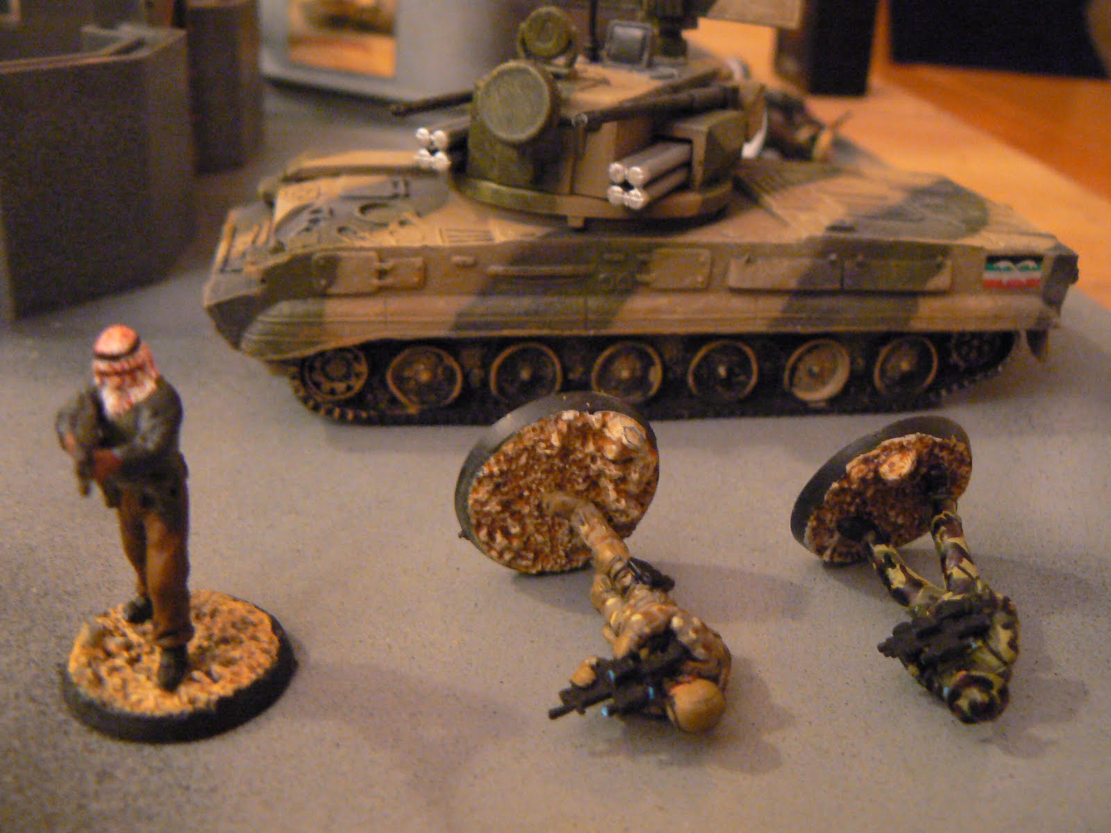 Le fusilier s'acharne sur le Tunguska mais continue de tirer à côté. Le médecin remet sur pied le mitrailleur et le leader se replace de façon à tirer sur le fuyard du groupe I, et le met Hors Combat. Profitant de l'inattention de l'artilleur du Tunguska, le groupe 2 contourne le bâtiment sur le flanc droit des insurgés.
